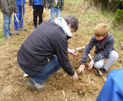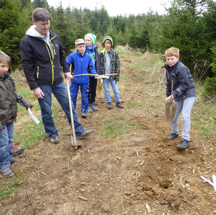 Nach einer kurzen Begrüßung ging es dann auch schon los. „Warum pflanzen wir eigentlich Bäume?“, fragte Bolko die Kinder. „Wegen der Photosynthese“. Die Bäume machen nämlich in ihren Blättern und Nadeln Sauerstoff, den wir zum Atmen benötigen. Der grüne Farbstoff kann mithilfe der Sonne das giftige Kohlendioxid aus der Luft und Wasser zusammenbringen und neue Verbindungen entstehen lassen. Vom Sauerstoff bleibt dabei das Meiste übrig und wandert in die Luft. „Außerdem pflanzen wir viele verschiedene Baumarten“, erklärt Bolko weiter, „weil der Wald wieder stabil werden soll.“ In der Vergangenheit haben die Waldbesitzer immer mehr Fichten gepflanzt, weil die so schnell und so schön gerade wachsen. Die Fichten haben aber einen großen Nachteil, den jeder, der im Wald spazieren geht, sehen kann oder spürt, wenn er drüber stolpert. Die Wurzeln breiten sich ganz flach an der Oberfläche aus. Kommt ein Sturm, dann sind die Fichten die ersten, die entwurzelt werden und umfallen. Natürlich müssen die Fichten nicht ganz verschwinden, meinte Herr Zencominierski. Aber wir pflanzen Bäume dazwischen, die Pfahlwurzeln haben, also fest und tief im Boden stecken. „Die halten dann die Flachwurzler fest. Auch das Laub der Bäume ist wichtig, es wird von den Regenwürmern in den Boden gezogen, verrottet dort und sorgt dafür, dass der Säuregehalt wieder ins Gleichgewicht kommt.“